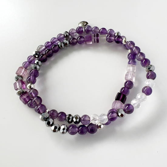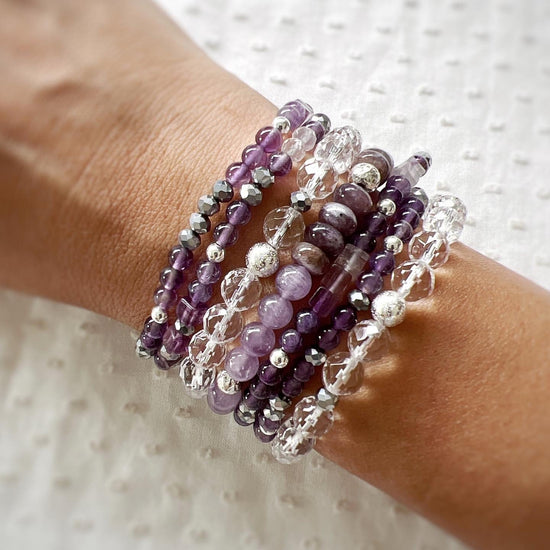 L'améthyste lavande favorise la paix, atténue le stress, accroît la conscience et soulage les douleurs physiques et émotionnelles. Associé à l'hématite, une « pierre de l'esprit », le cristal stimule la concentration et l'attention. Le violet doux de ce bracelet respire le calme et l'élégance.