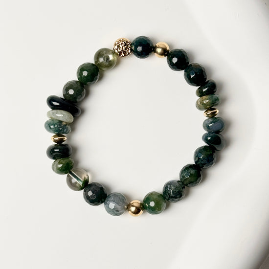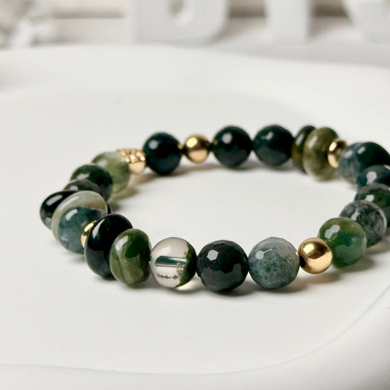 This elegant bracelet features deep green Moss Agate and golden-threaded Rutilated Quartz, accented with polished gold-filled beads. A balanced blend of earthy tones and subtle shine—perfect for everyday wear or a thoughtful gift.