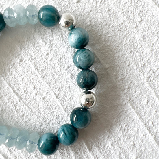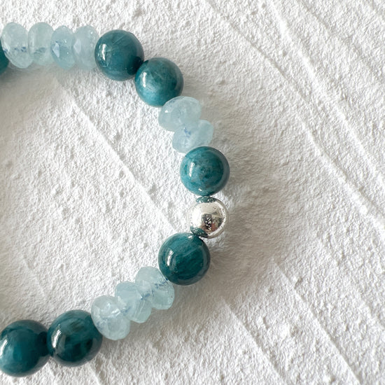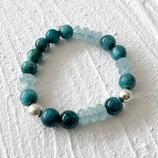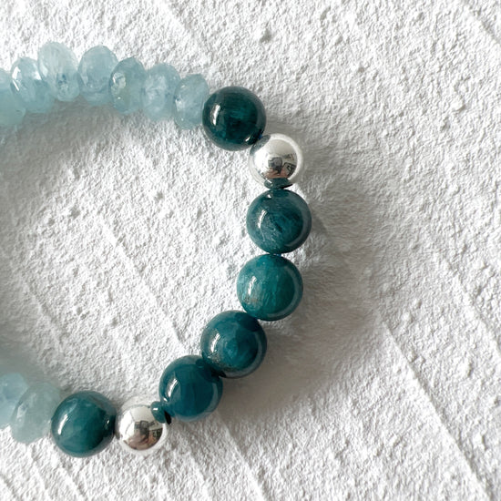 Apatite, a stone of manifestation, it helps to increase motivation and draws off negativity about oneself and others. Paired with Aquamarine, a stone of courage, its calming energies reduce stress and quiet the mind.