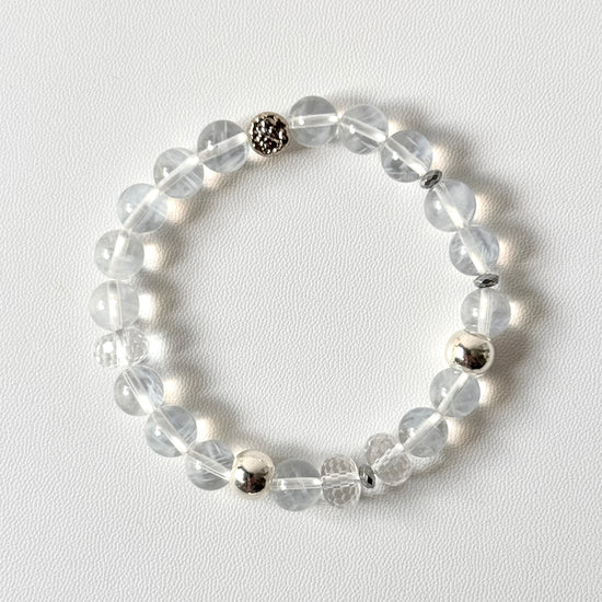 A serene fusion of healing energy and understated elegance. This bracelet features ethereal Blue Needle Quartz (also known as Angel Feather Quartz) for calm, clarity, and enhanced communication. Clear Quartz amplifies energy and intentions, while 925 sterling silver beads add timeless polish and hypoallergenic comfort.
