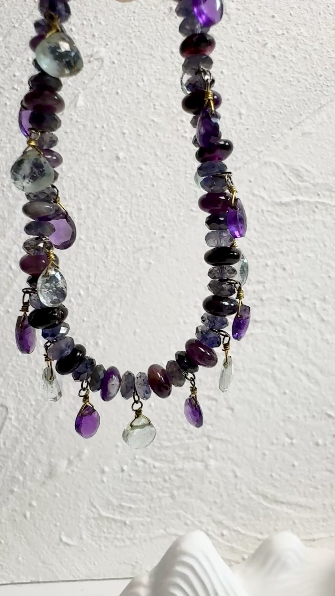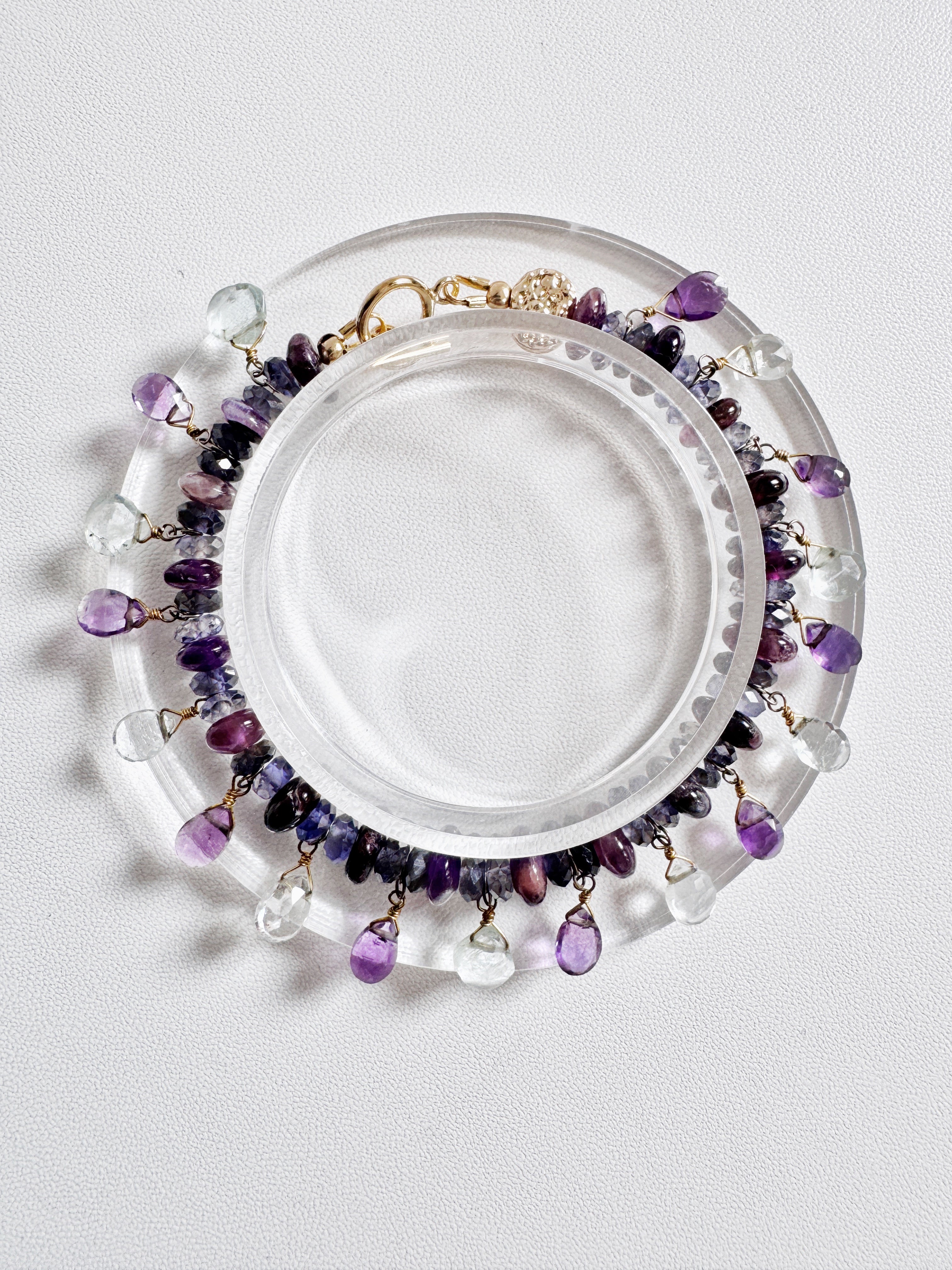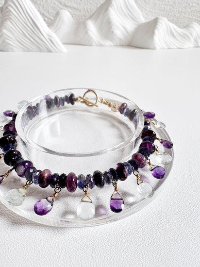 Charoite and Iolite bracelet featuring Amethyst and Clear quartz briolette dangles, crafted with durable wire and secure toggle clasps for everyday wear.