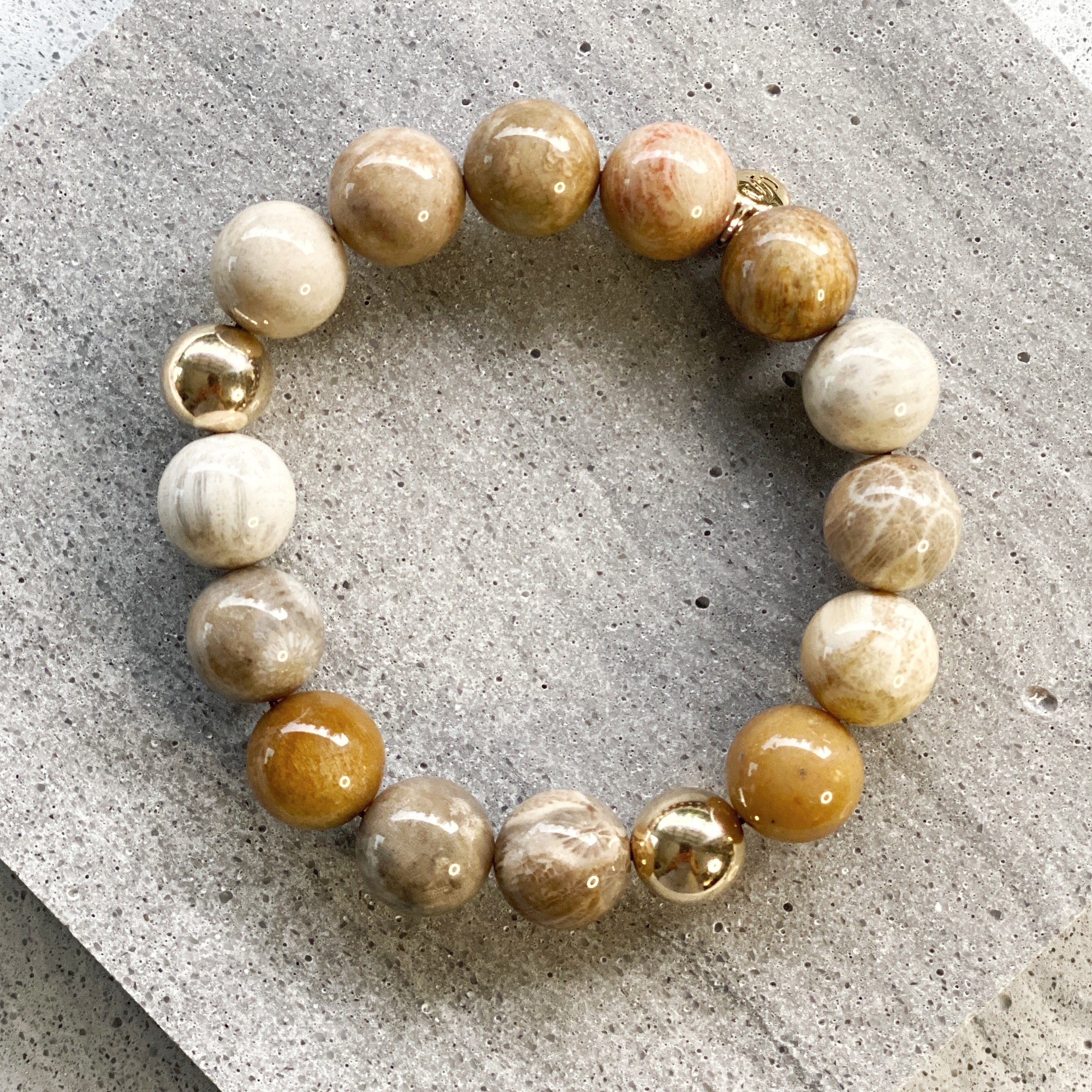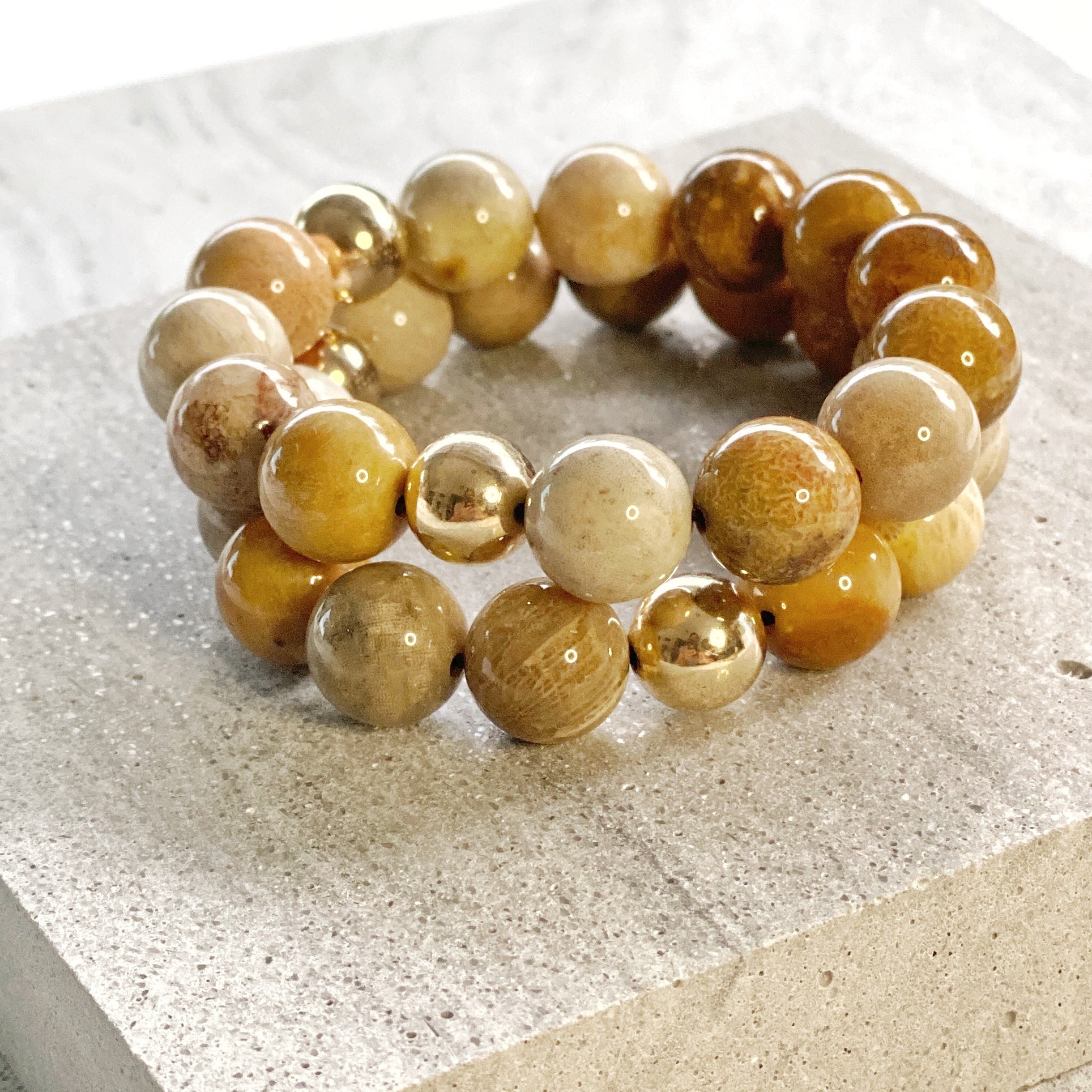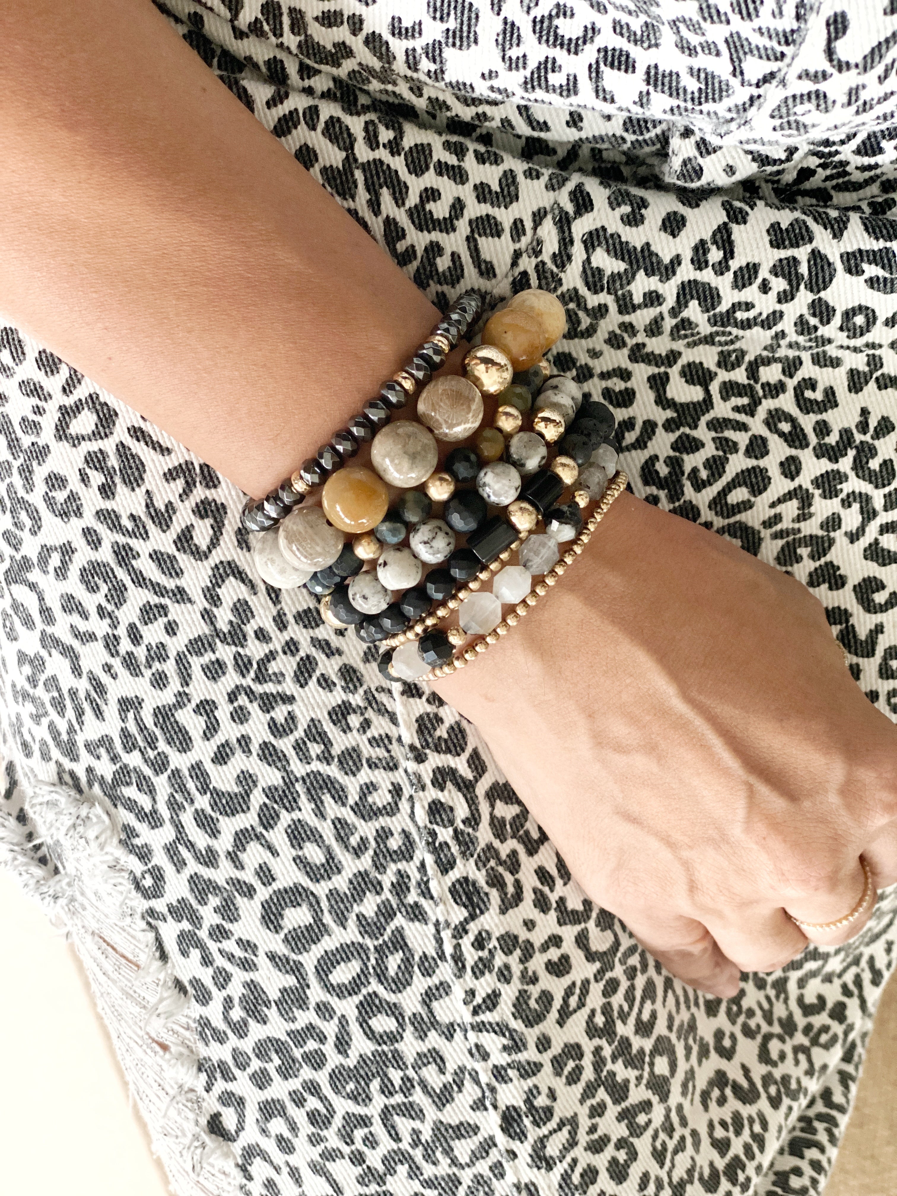 - Strung on durable stretchy cord
