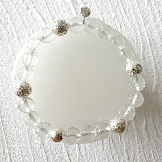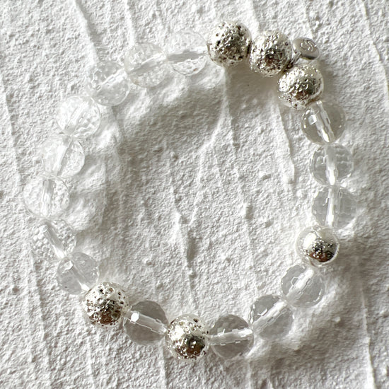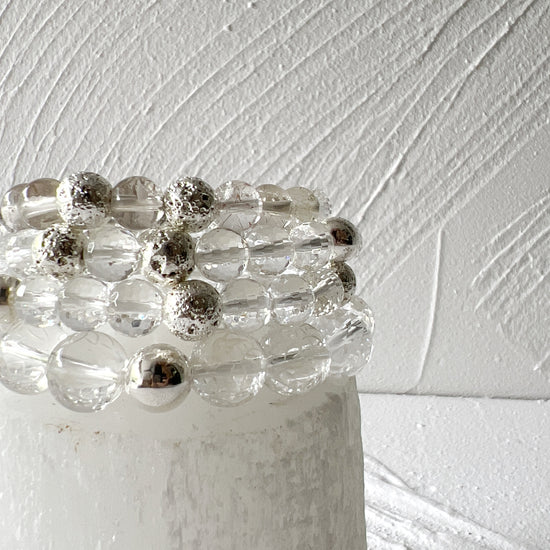 This master healer can amplify all energies including the energy of a person, crystal, plant, and radio frequencies. Clear Quartz has the ability to absorb, store, release, and regulate energy. Paired with silver dipped Lava Stone, a stone of transformation, it is a useful companion through change, imparting strength and perseverance.