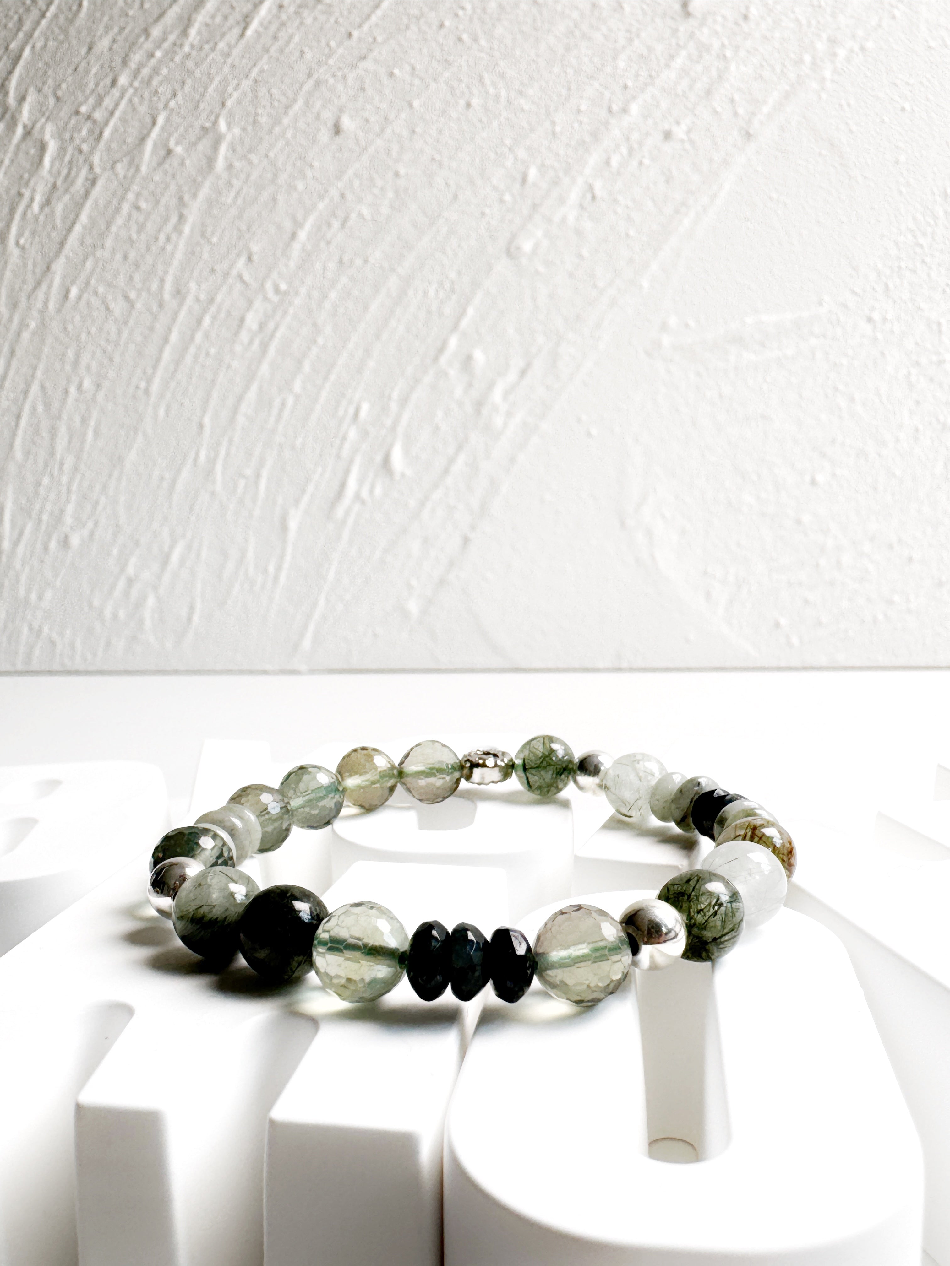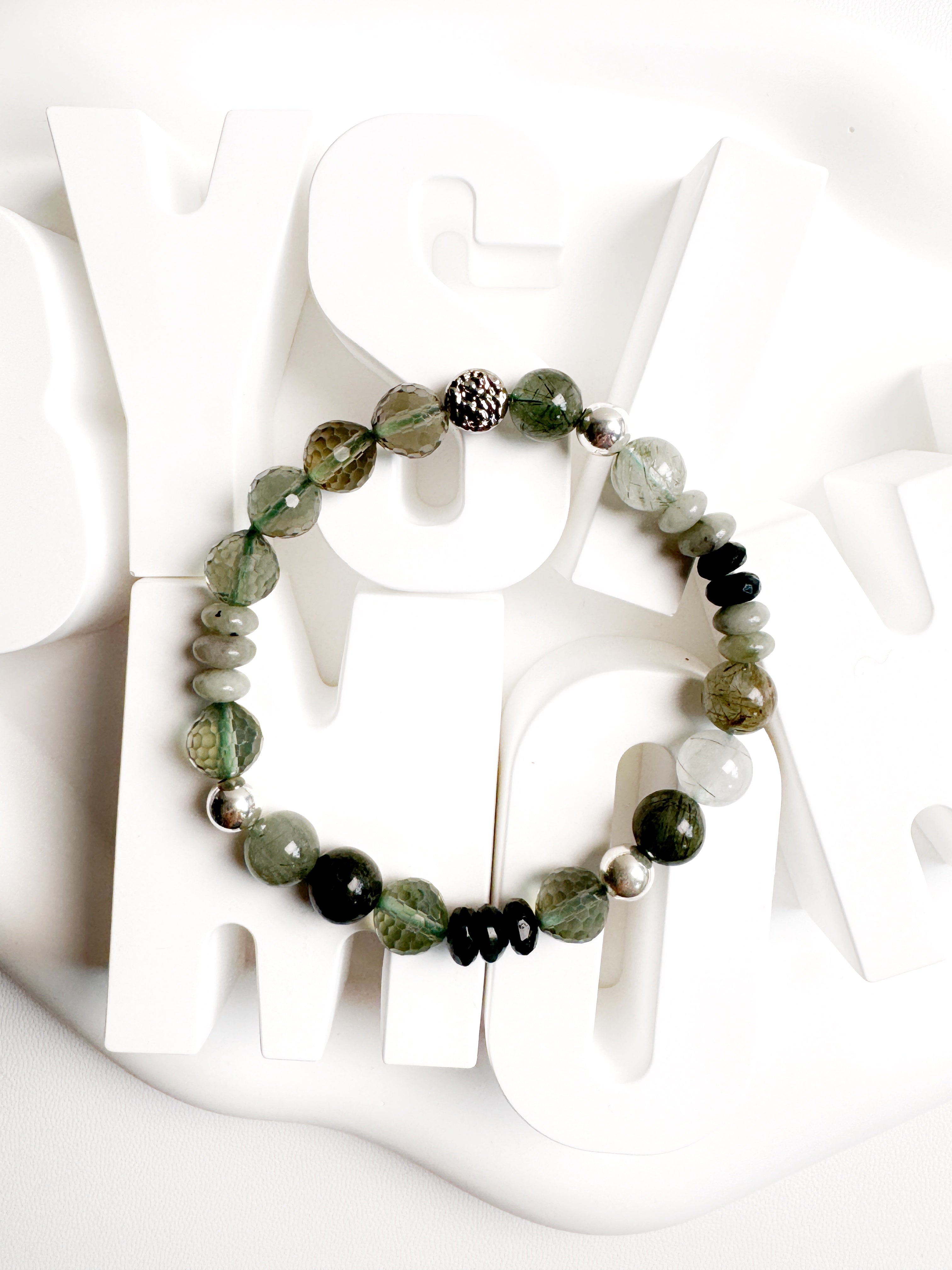 This handcrafted braelet combines the calming hues of Fluorite, the harmonious energy of Jade and the grounding beauty of Moss Agate, accented with Sterling Silver. A perfect balance of elegance and natural charm.