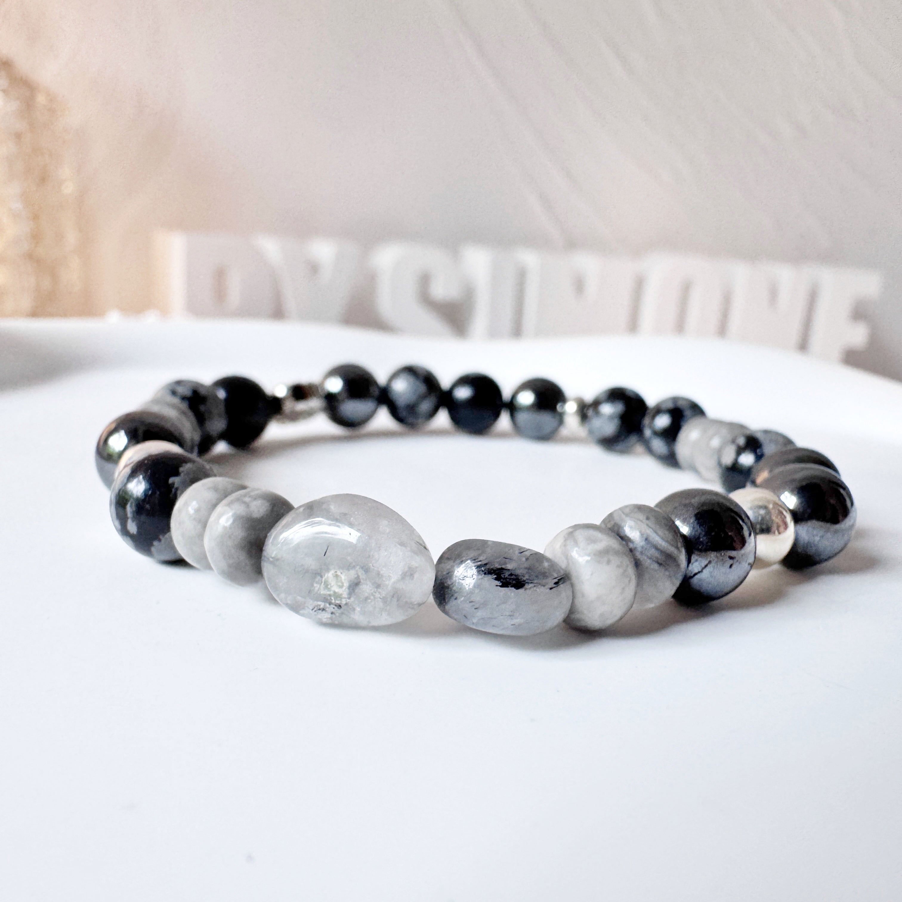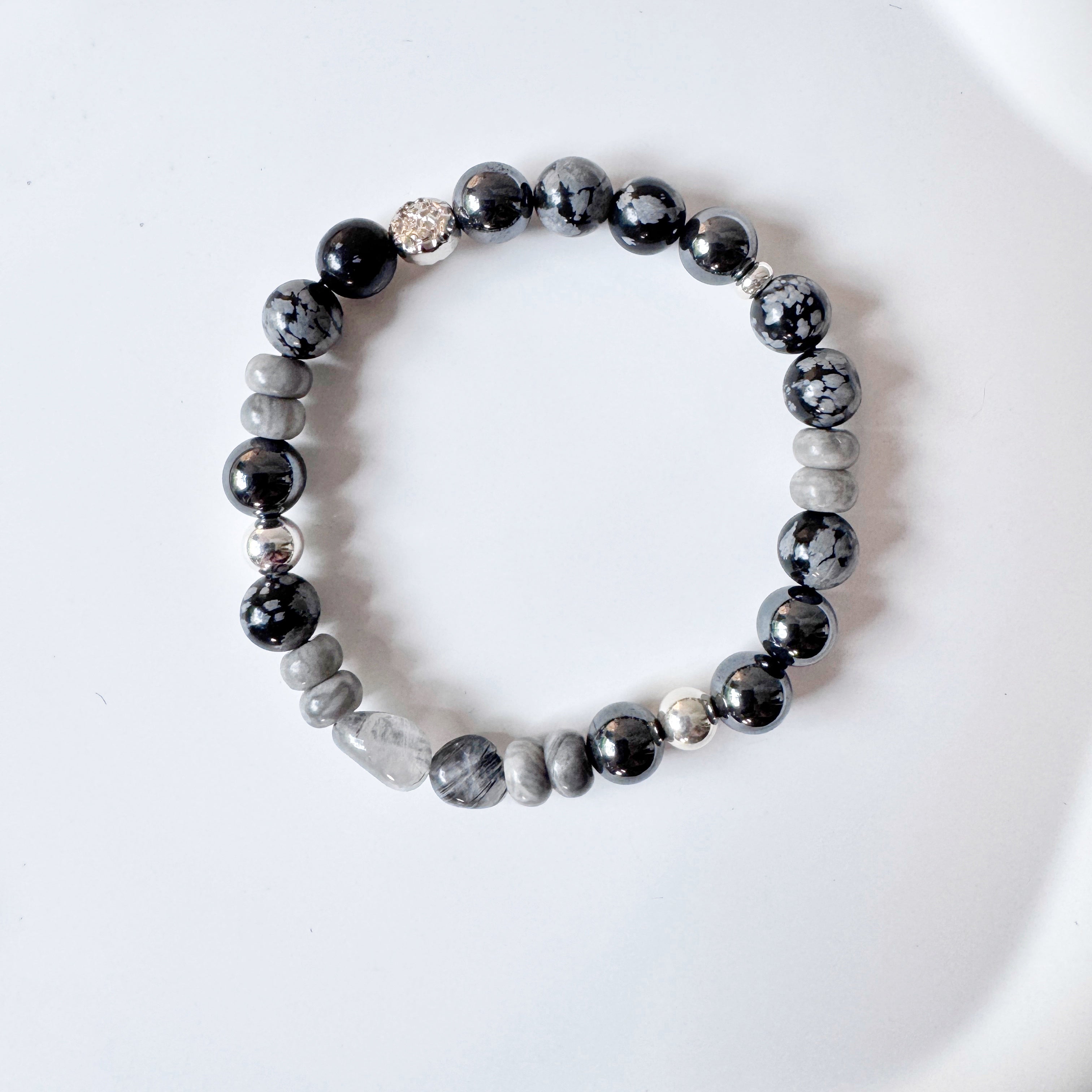 Crafted with care, this bracelet features the natural warmth of Picture Jasper, known for its calming, nurturing energy and earthy patterns. Hematite beads add a sleek metallic sheen and grounding presence, promoting focus and balance. The mysterious shimmer of Black Rutilated Quartz adds depth and a touch of intrigue, with fine black rutile inclusions catching the light in unexpected ways. Finished with sterling silver elements for a classic, refined touch.