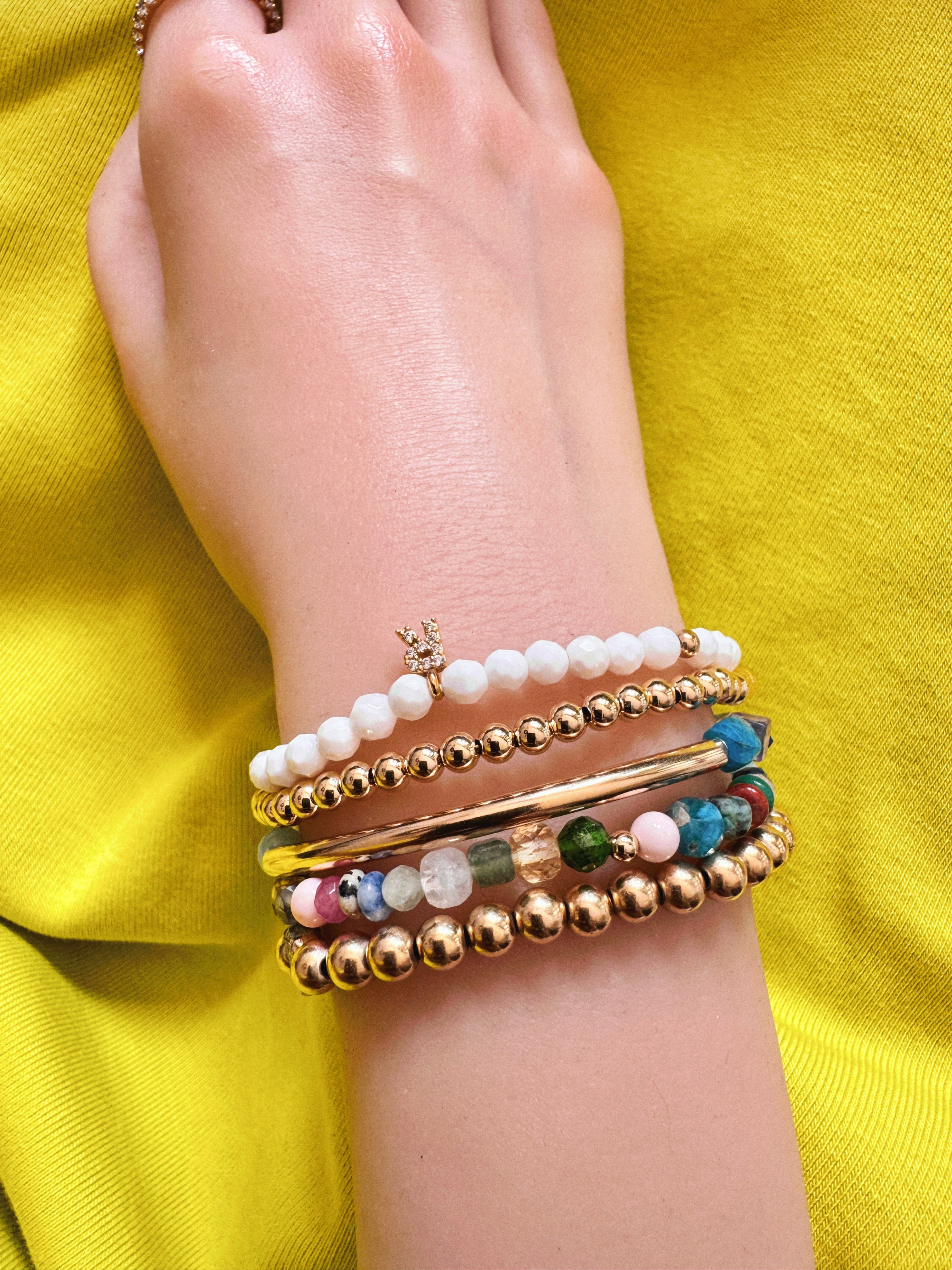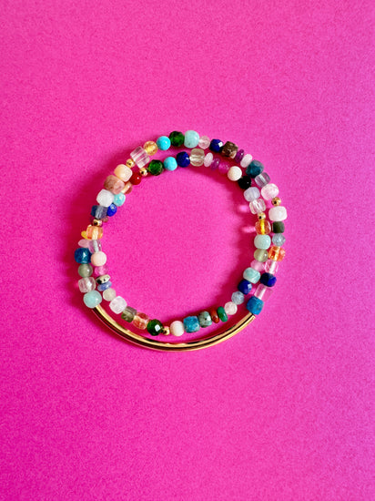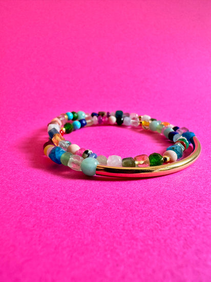 A vibrant bracelet crafted with multi-coloured crystals featuring a striking gold tube and 14k gold filled beads, perfect for adding a touch of elegance and colour to any outfit.