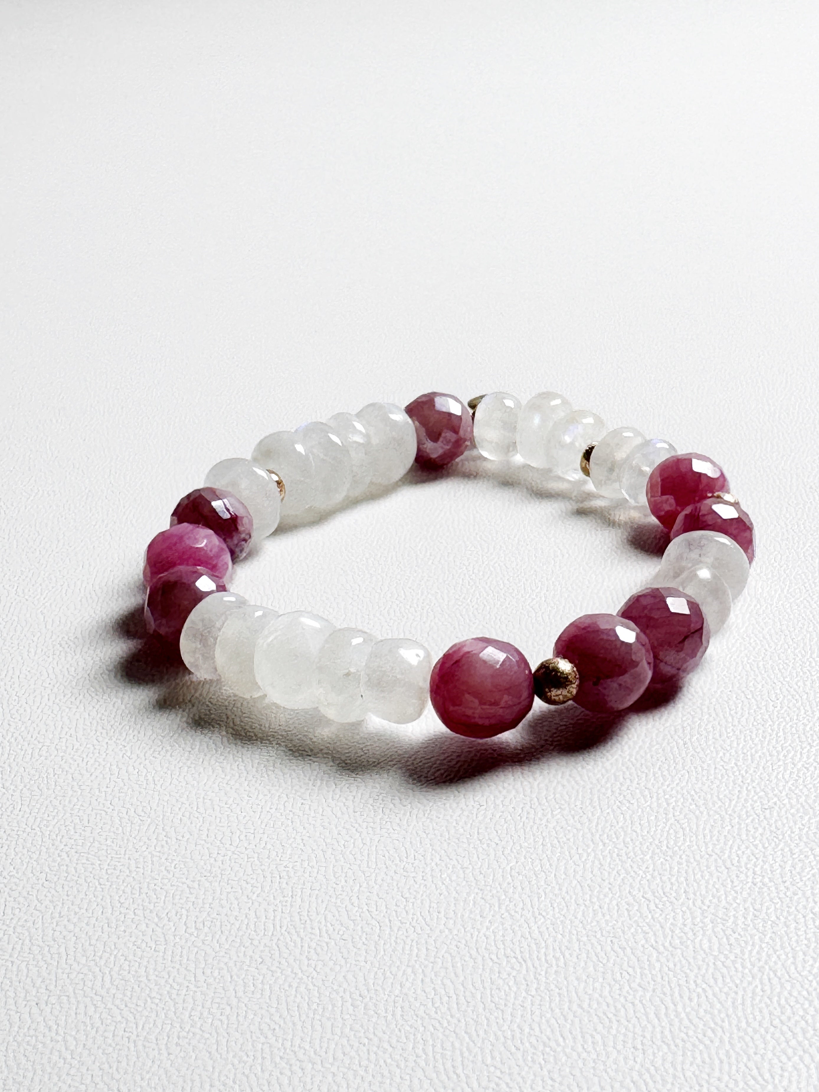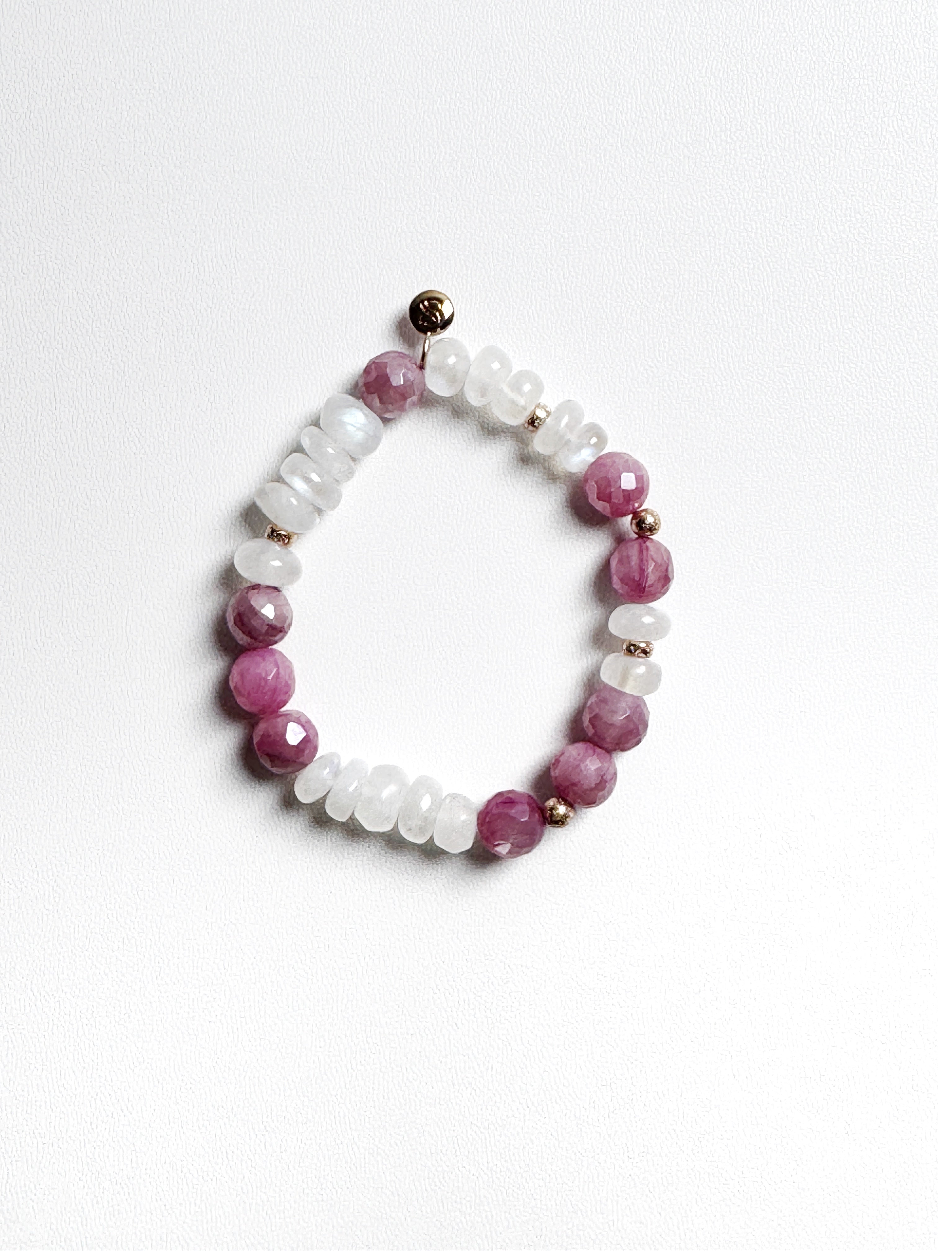 This elegant bracelet combines faceted pink moonstone and rainbow Moonstone, creating a soft, radiant look. Accented with rose gold-filled elements, it brings a warm touch to the design. The pink moonstone’s gentle hues complement the iridescent glow of rainbow moonstone, symbolizing love and inner peace. Perfect for adding a subtle charm to any ensemble.